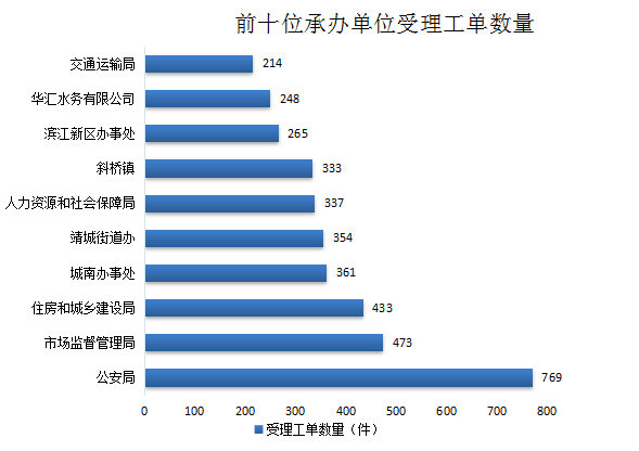 本月,工单受理涉及89个承办单位中的69个,工单数量前十的单位为: