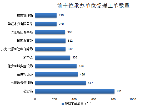 本月,工单受理涉及89个承办单位中的65个,工单数量前十的单位为: