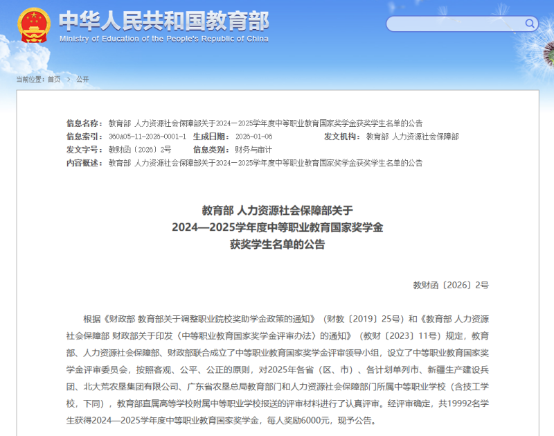 近日教育部、人力资源和社会保障部公布2024—2025学年度中等职业教育国家奖学金获奖学生名单,我市共有6名优秀学子获此殊荣。