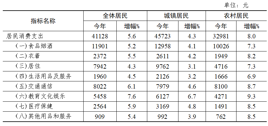 居民消费活力释放。全年城乡居民人均消费支出41128元,增长5.6%。其中,城镇居民人均生活消费支出45723元,增长4.3%;农村居民人均生活消费支出32981元,增长8.0%。分类看,食品烟酒支出增长5.2%;衣着消费支出增长5.5%;居住支出增长4.3%;生活用品及服务支出增长4.5%;交通通信支出增长6.1%;教育文化娱乐支出增长7.6%;医疗保健支出增长5.9%;其他用品和服务支出增长5.4%。